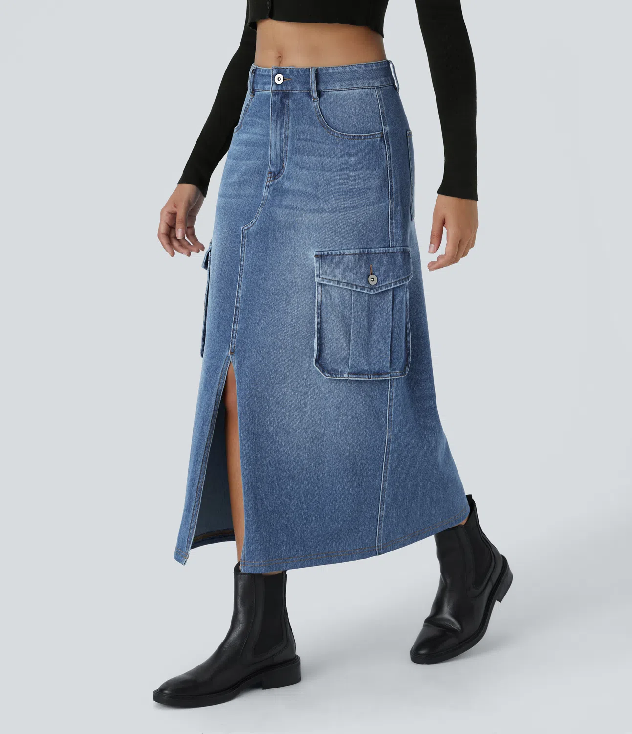 Halara Flex™ Mid-Waist Button Zipper Multiple Pocket Split A-Line Stretch Knit Denim Maxi Casual Cargo Skirt