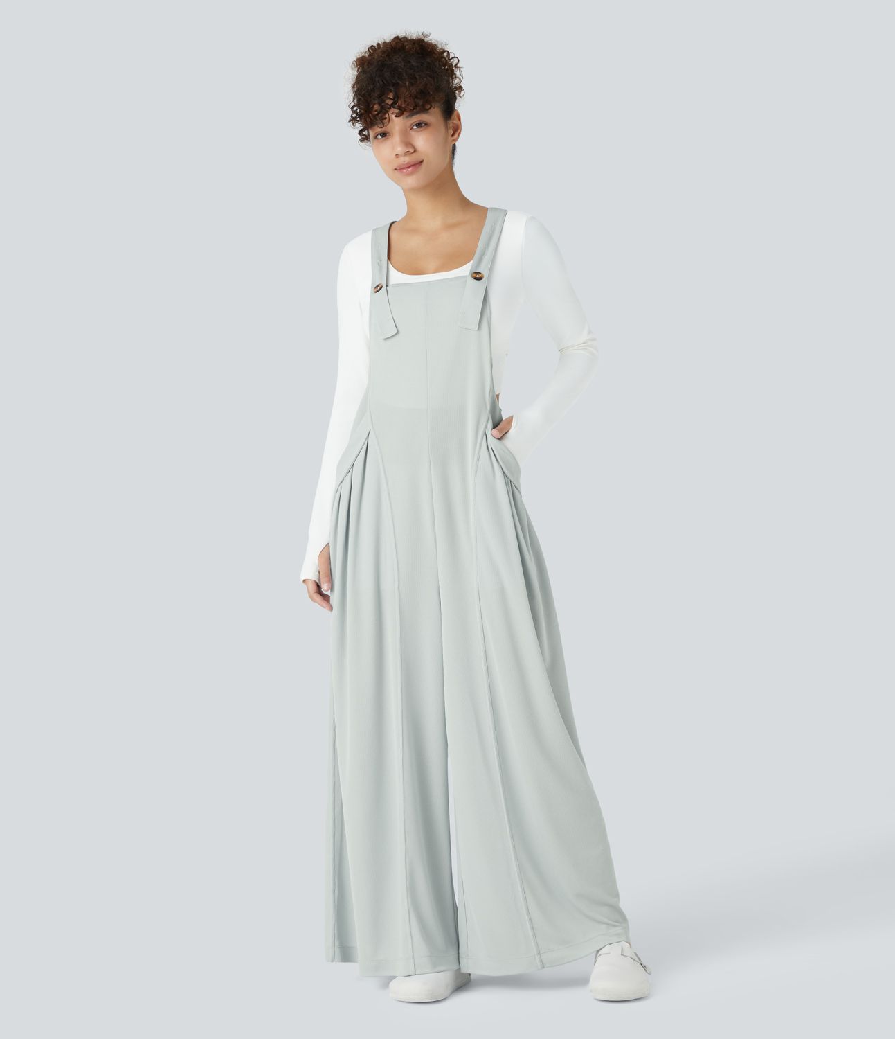 Adjustable straps, side pockets, pleats, wide waffle casual overall with buttons
