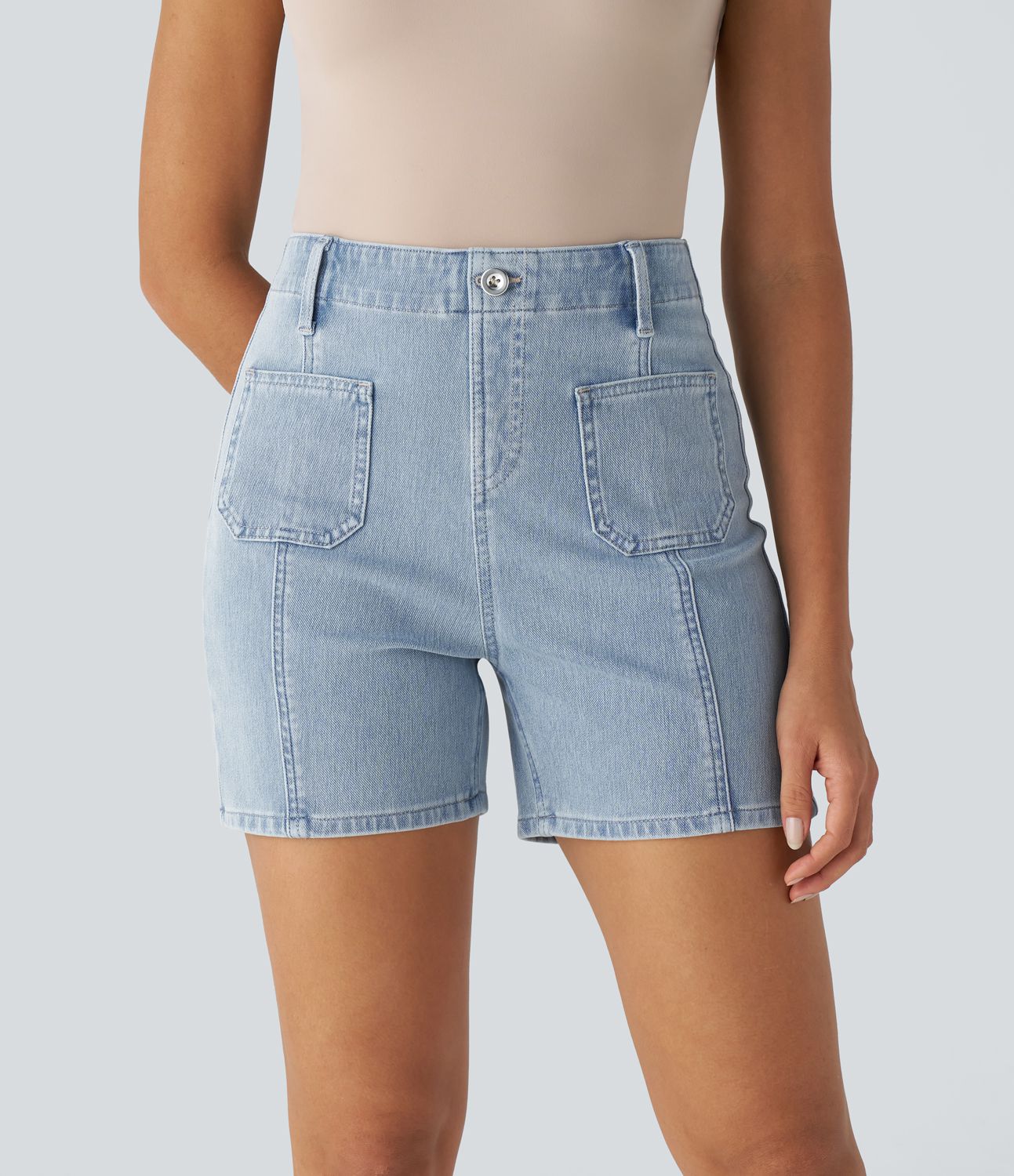 Halara Flex™ 하이 웨이스트 장식 버튼 프론트 포켓 워싱된 신축성 있는 니트 데님 캐주얼 반바지
