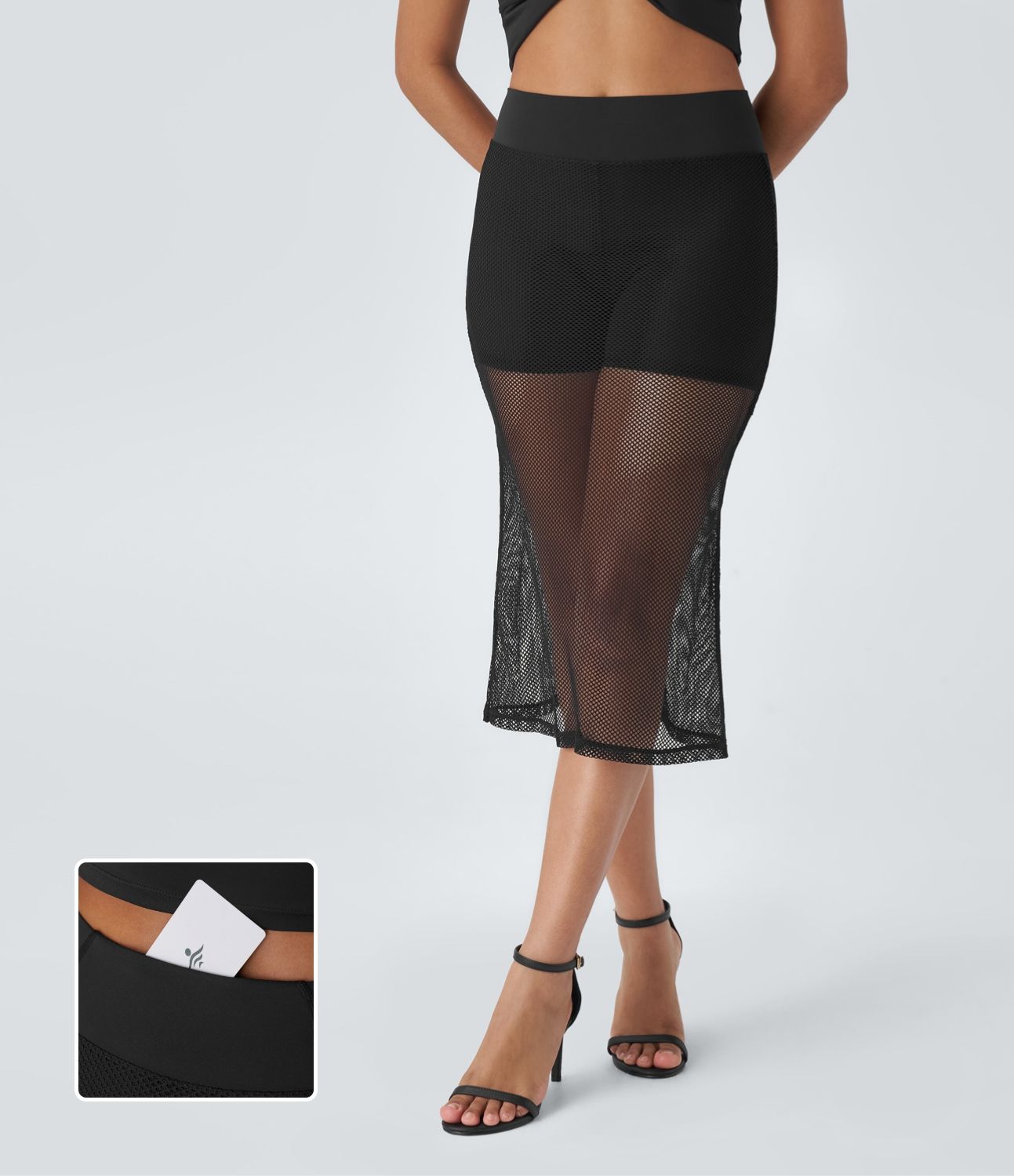 하이웨이스트 뒷주머니 2-in-1 미디 시어 메시 리조트 스커트