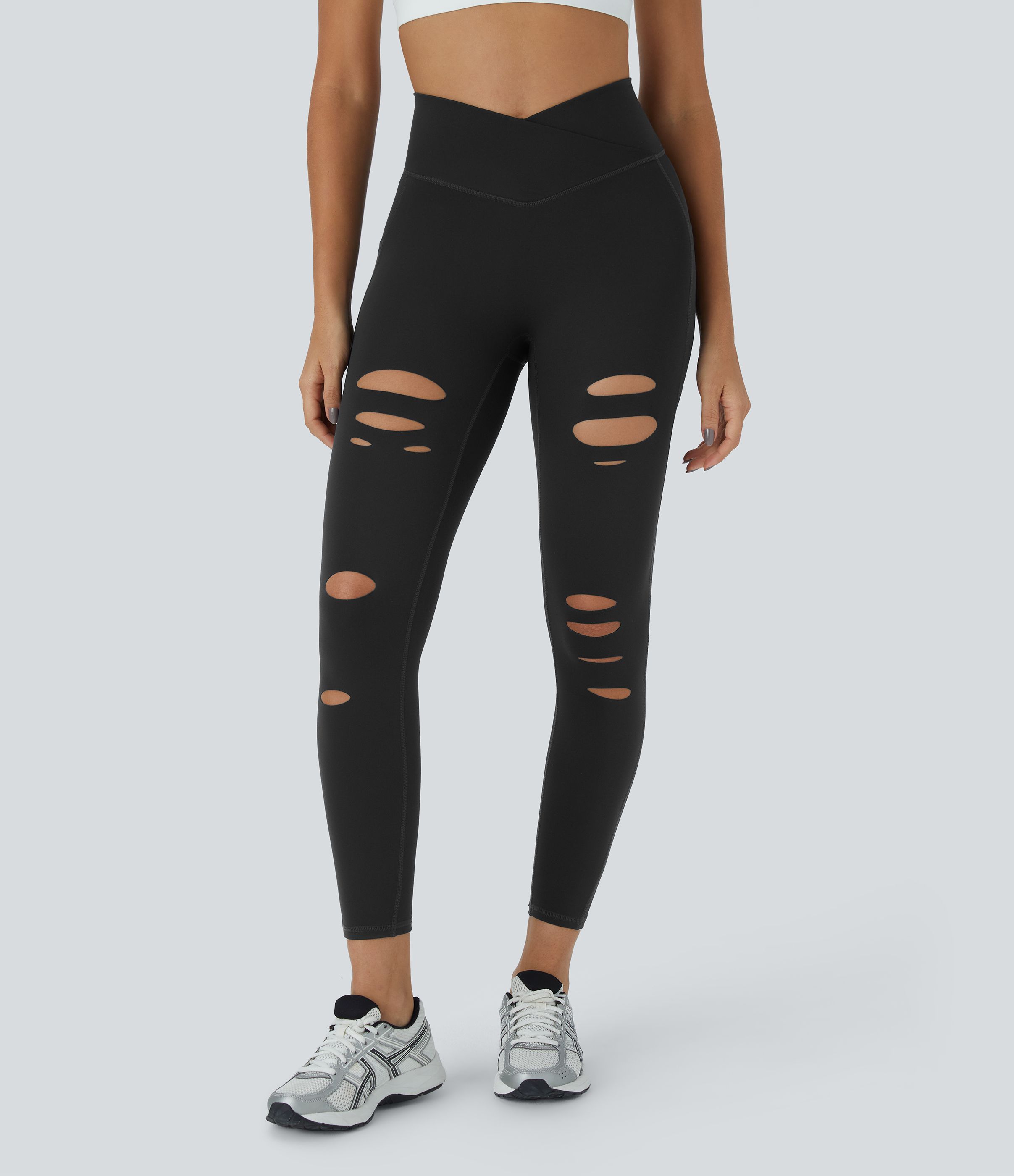 High-waist crossover side pocket ripped design cutout casual 7/8 leggings