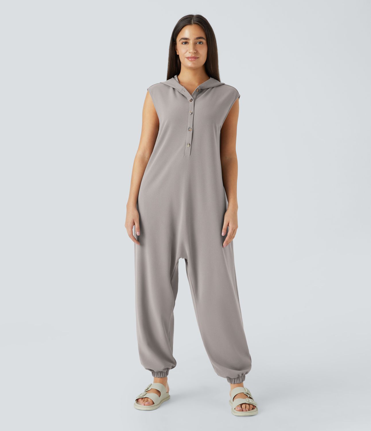 Hooded front button sleeveless side pocket waffle casual jumpsuit