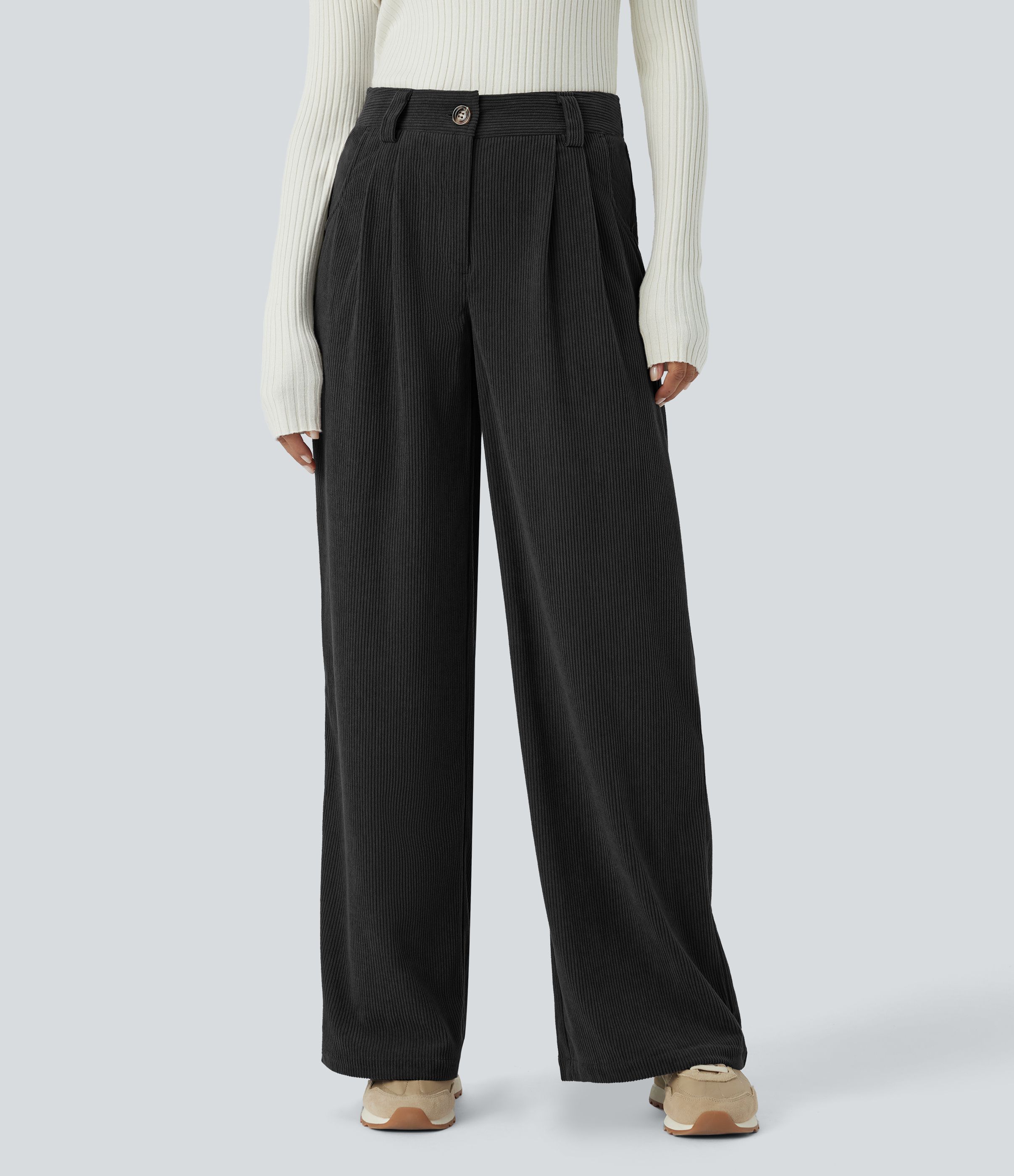 Mid-waist button zipper side pocket solid color corduroy wide casual pants
