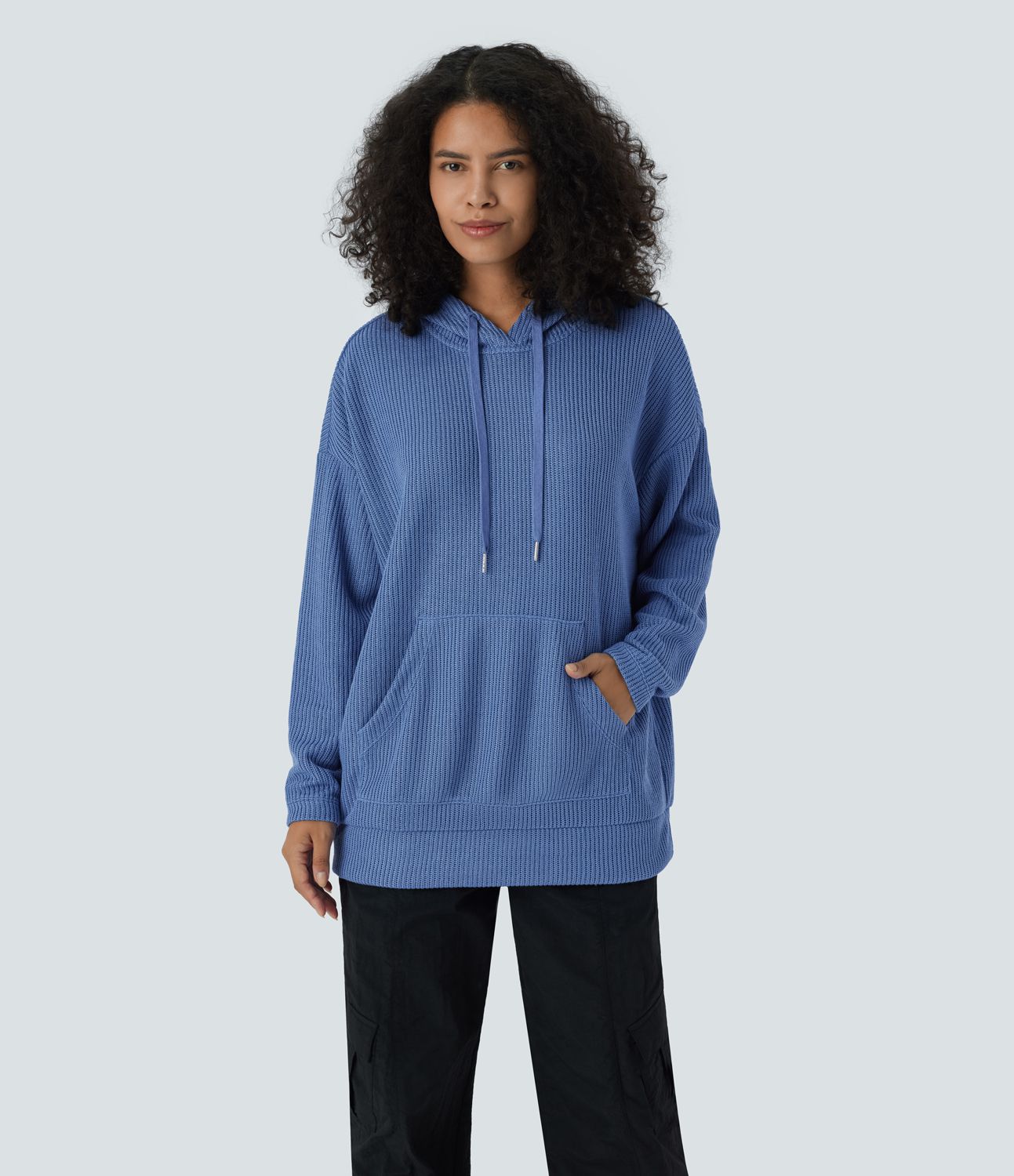 골지 니트 후드 드로우스트링 드롭 숄더 캥거루 포켓 오버사이즈 캐주얼 스웨트셔츠