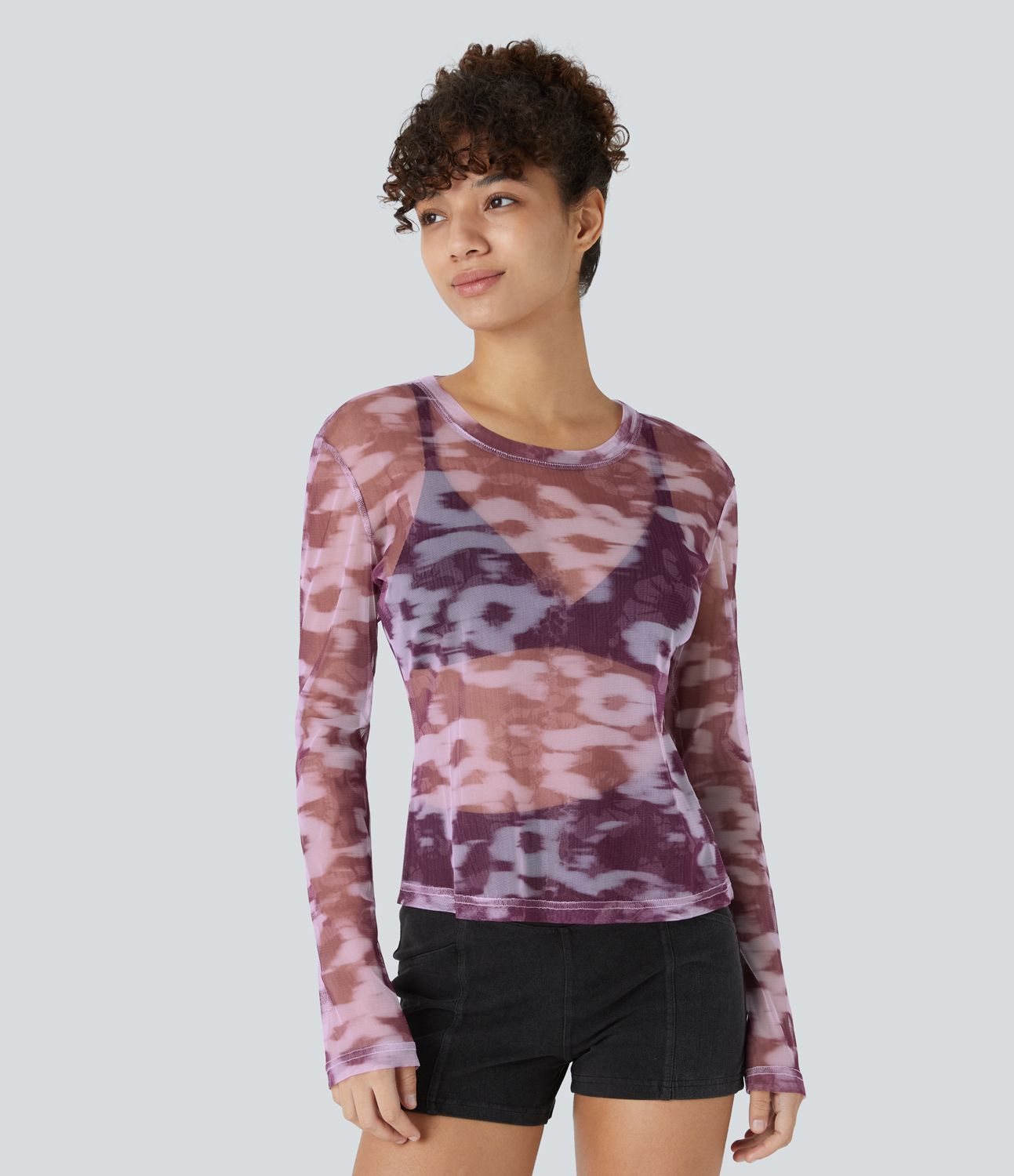 Round neck long-sleeved flower print slim see-through casual top