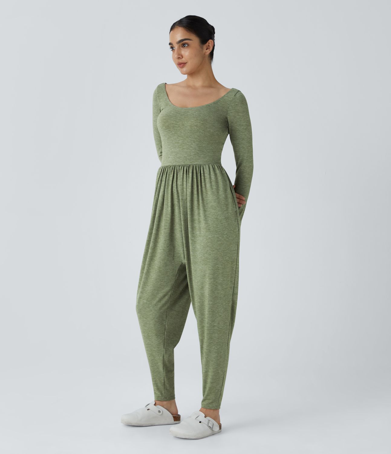 스쿱넥 백리스 주름 옆주머니 캐주얼 하렘 점프수트