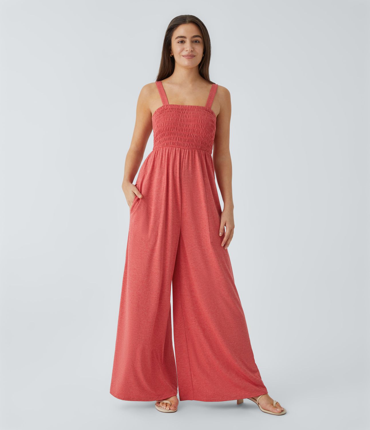Square neck Shirring Side Pocket Wide Vacation Look Jumpsuit