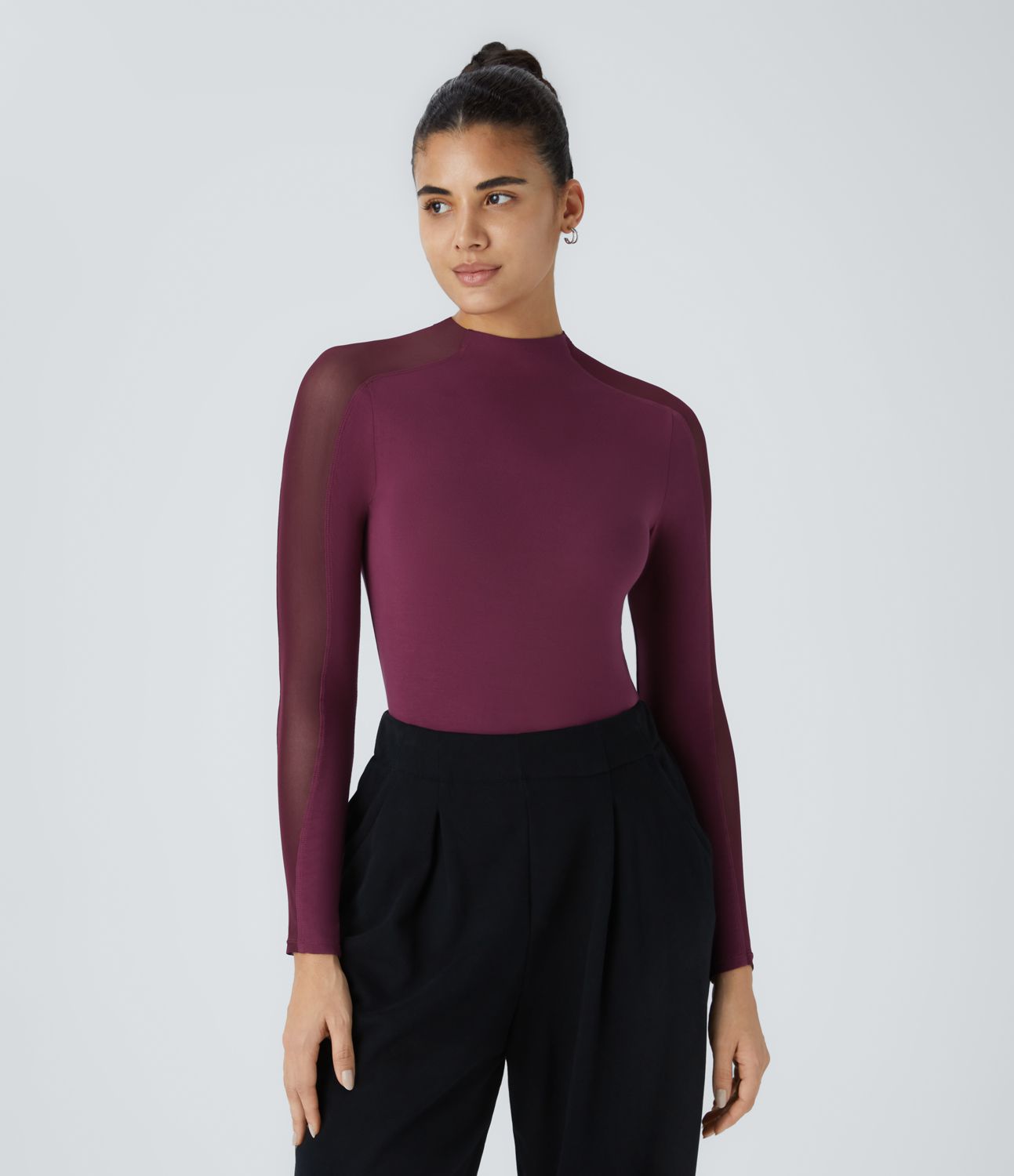 Mesh skinny work look top compared to stand collar raglan long sleeve