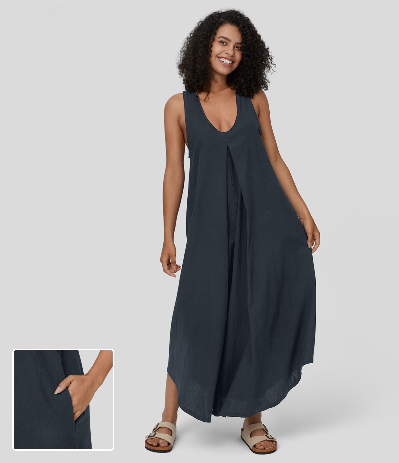 U-neck sleeveless pleated side pocket flowy maxi casual linen-feel dress